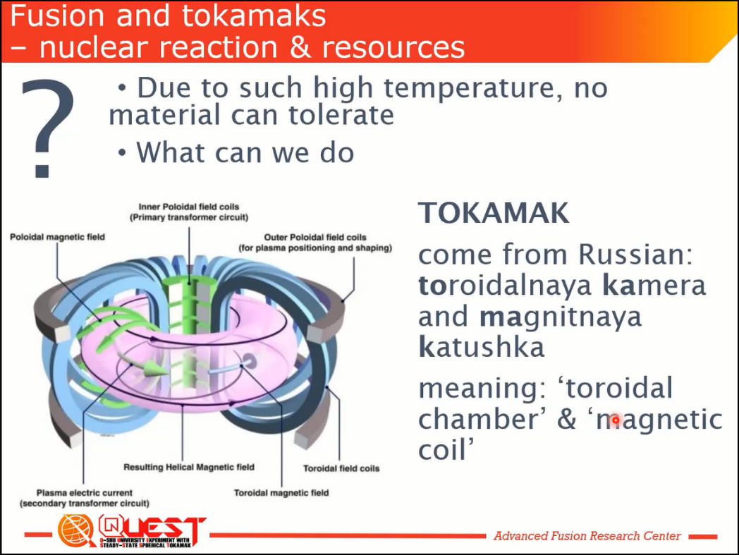 - 地上に人工太陽を作るといった核融合発電を目指した研究をしています。核融合発電を行うために、日本と欧州共同で作った『JT-60SA』という装置がありまして、こちらと共同研究をやらせていただいています。私自身はずっとこの核融合プラズマの研究をやっており、九州大学では「QUEST(クエスト)」という大きな実験装置を作って運転しています。QUESTの最大の目的は、将来の核融合発電です。発電しようと思うと1年間ぐらい運転し続けなければいけないんですが、現在の世界記録というのはQUESTが持っている6時間です。これを1年という時間に延ばすためには、まだたくさんの基礎研究が必要ですので、そういった研究を行っています。