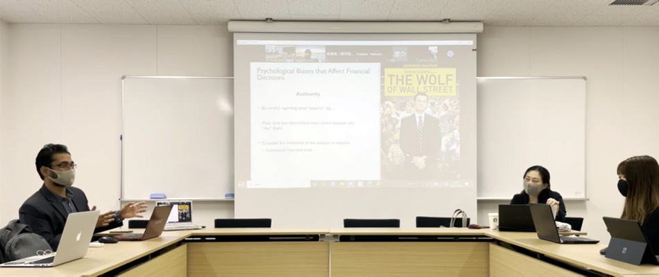 - 3回の授業の構成は彼がやりましたが、1回目に彼が作ってきた授業案は学生には少し難しすぎると私が判断したので、修正してもらったりしました。授業を任せるといっても、通常の「講義」の場合には私が内容を決めて「これとこれを教えてください」と言うことができますが、「演習」ですので、比較的柔軟に「資本市場で株式を買う時に有益と思われる情報を、日本人にはない視点から、学生さんに英語で提供してもらいたい」というリクエストをしました。そのためか、私が思っていた内容と違うような事もありました。どの程度授業内容のすり合わせを行うべきかについては改善の余地があるかと思います。